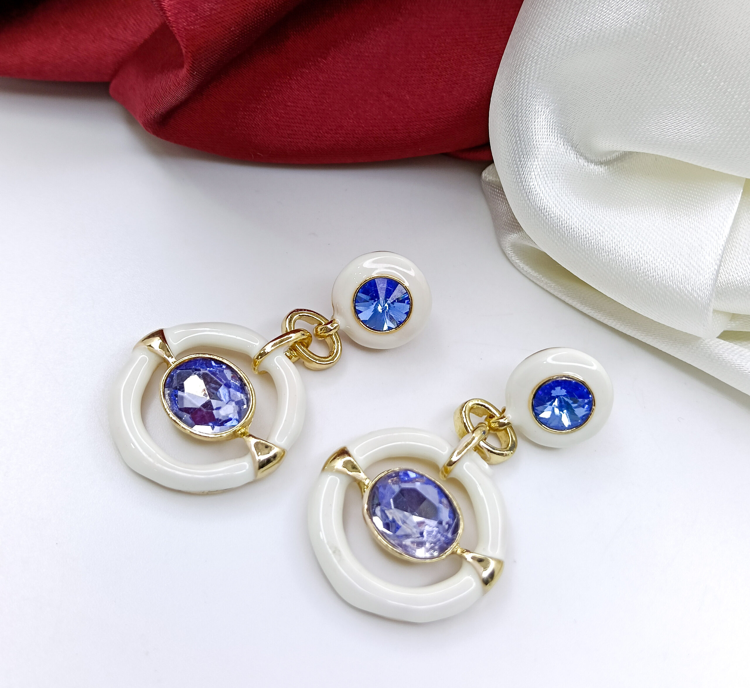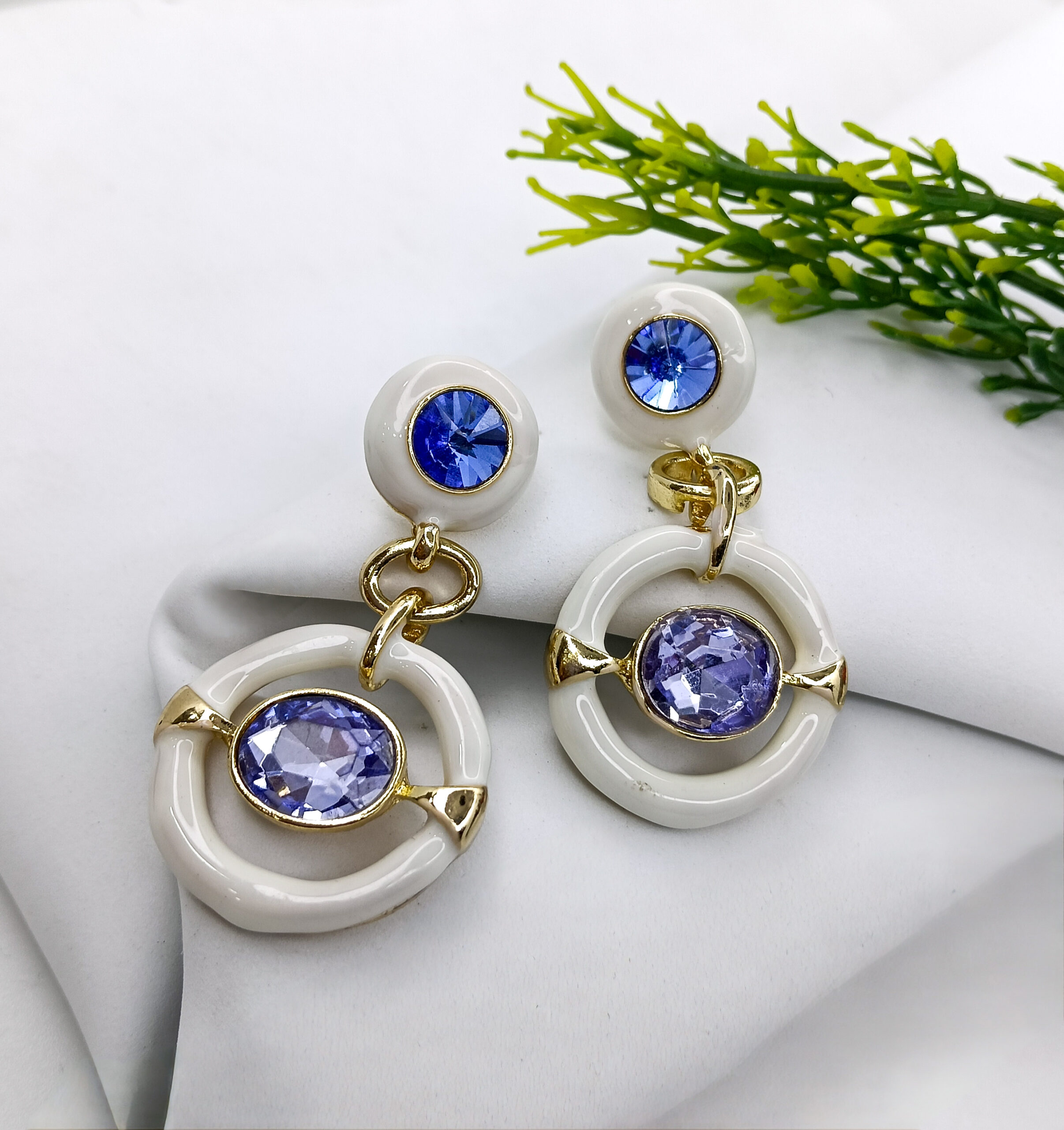 These striking drop earrings blend glossy ivory enamel circles with sparkling blue gems in a triple-stacked design, accented by gold-tone detailing. The playful mix of colors and geometric shapes creates a fresh, modern look, perfect for adding a touch of glamour to day or evening outfits. Their lightweight construction ensures comfortable wear throughout the day.