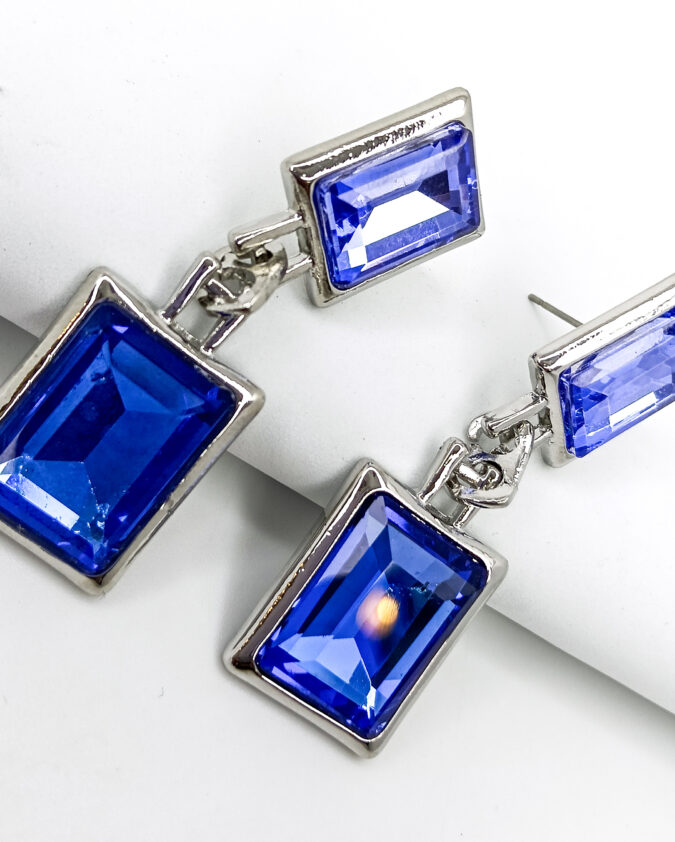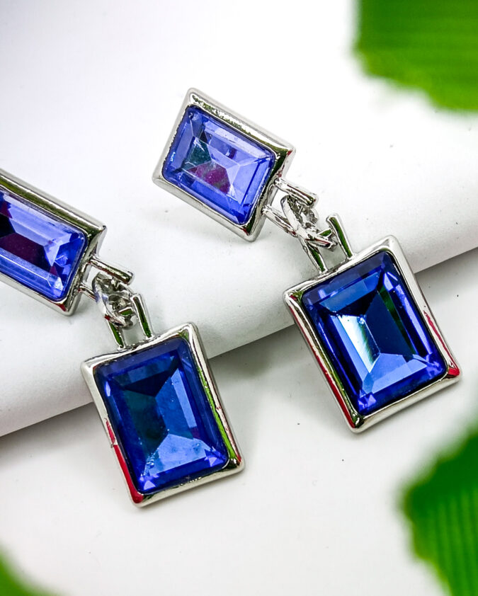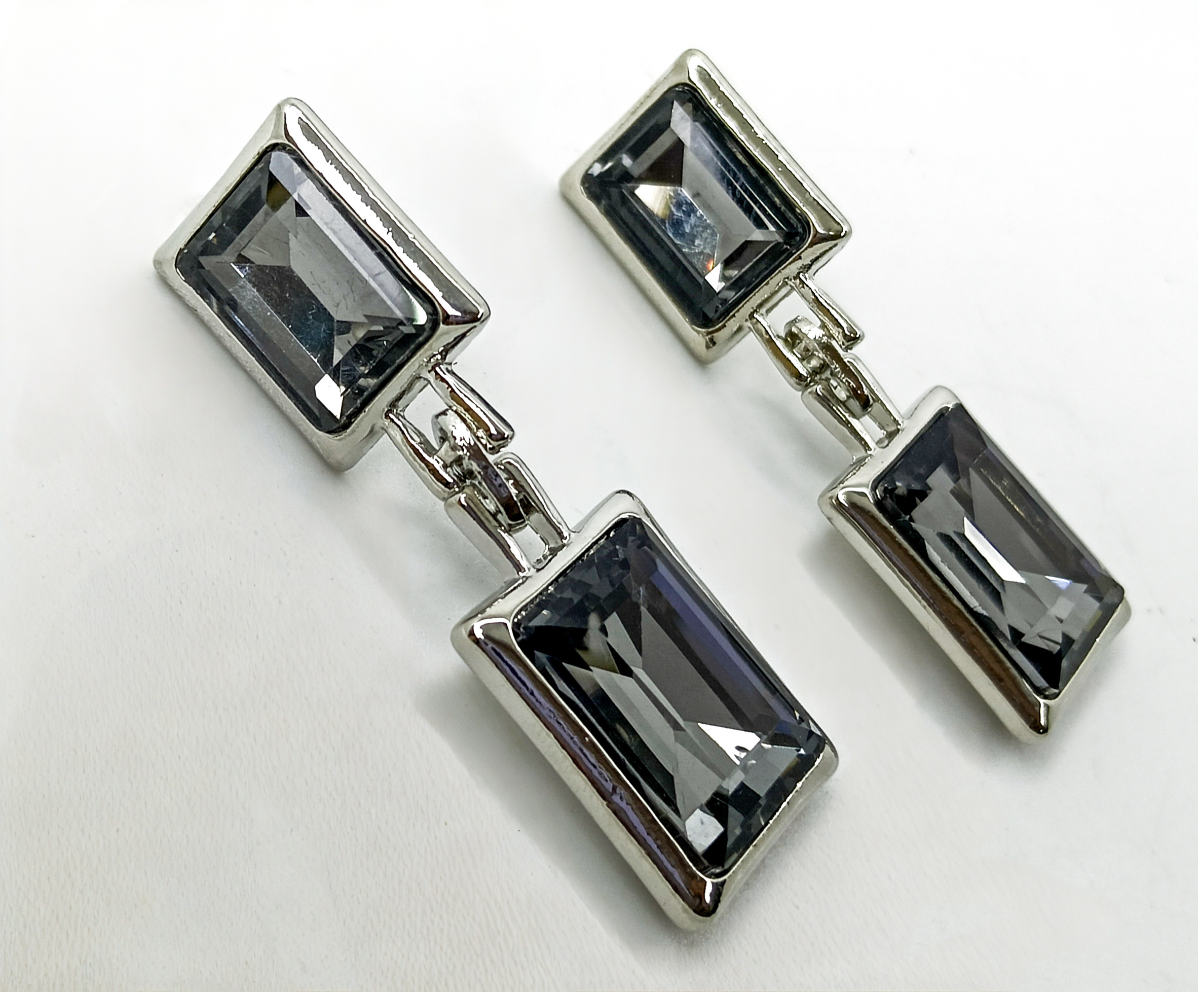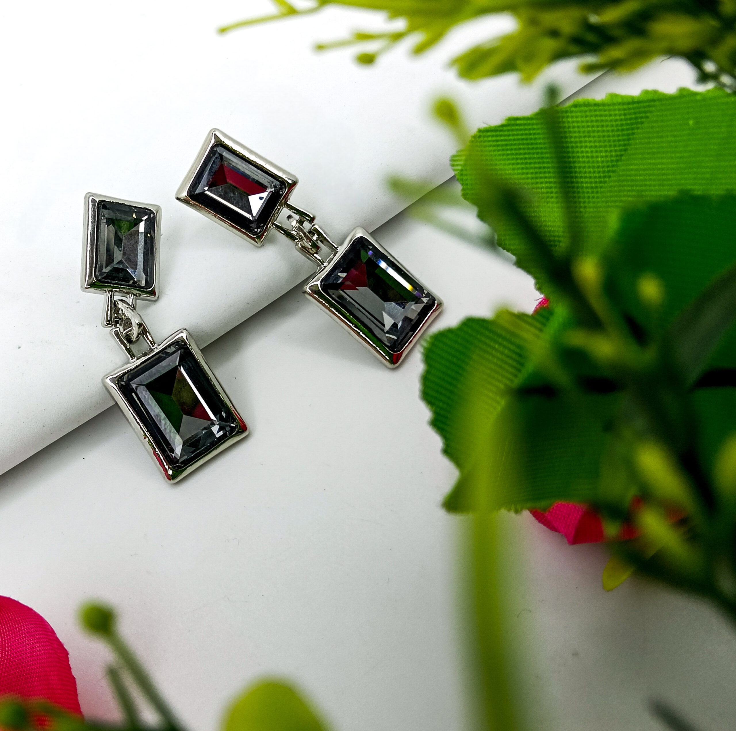 These elegant earrings feature striking rectangular gray gemstones set in polished silver-tone frames. The geometric double-drop design offers a modern, minimalist look that adds a touch of refined sophistication to any outfit. Their neutral color palette makes them a versatile accessory for both formal events and stylish everyday wear.