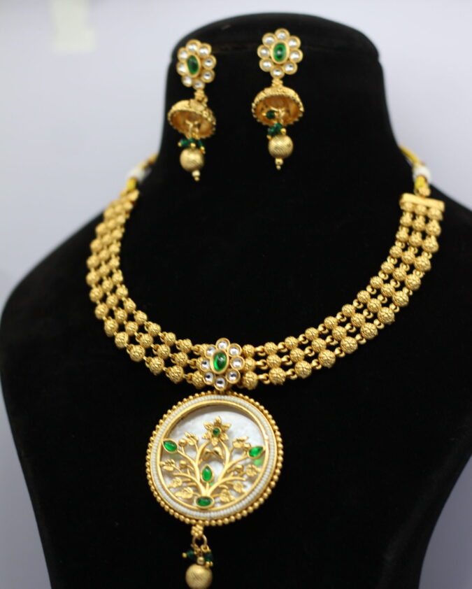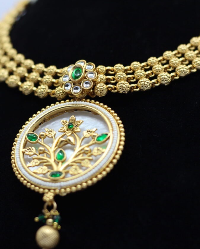 Crafted from premium alloy with high-quality gold plating, this necklace offers durability, long-lasting shine, and skin-friendly comfort. The subtle green charms add a refreshing pop of color, making it an ideal accessory for both casual and festive looks.