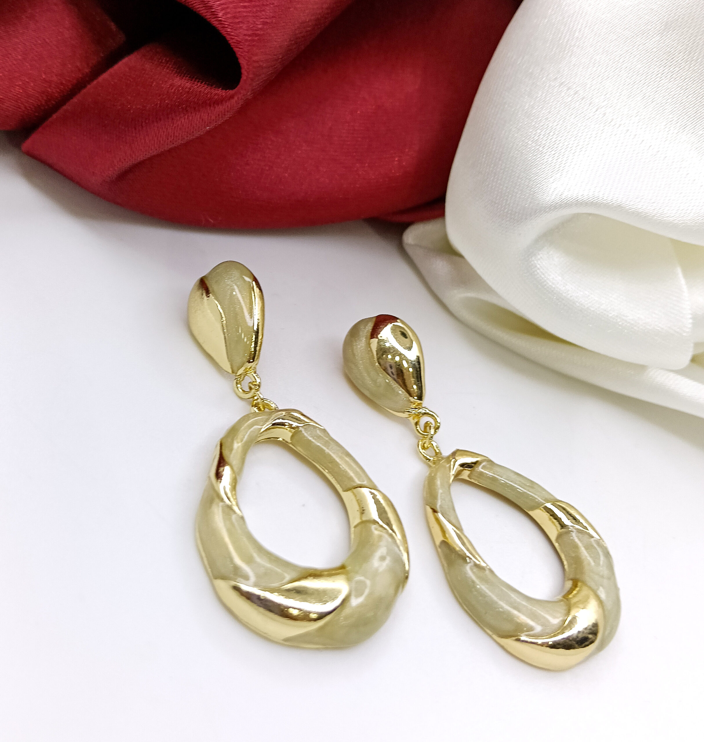 These elegant drop earrings feature a modern teardrop design with interwoven gold-tone and pearlescent ivory swirls. The smooth, glossy finish and rounded shapes offer a luxurious yet versatile accessory that suits both classic and contemporary styles. Ideal for adding a refined sparkle to evening or day looks.
