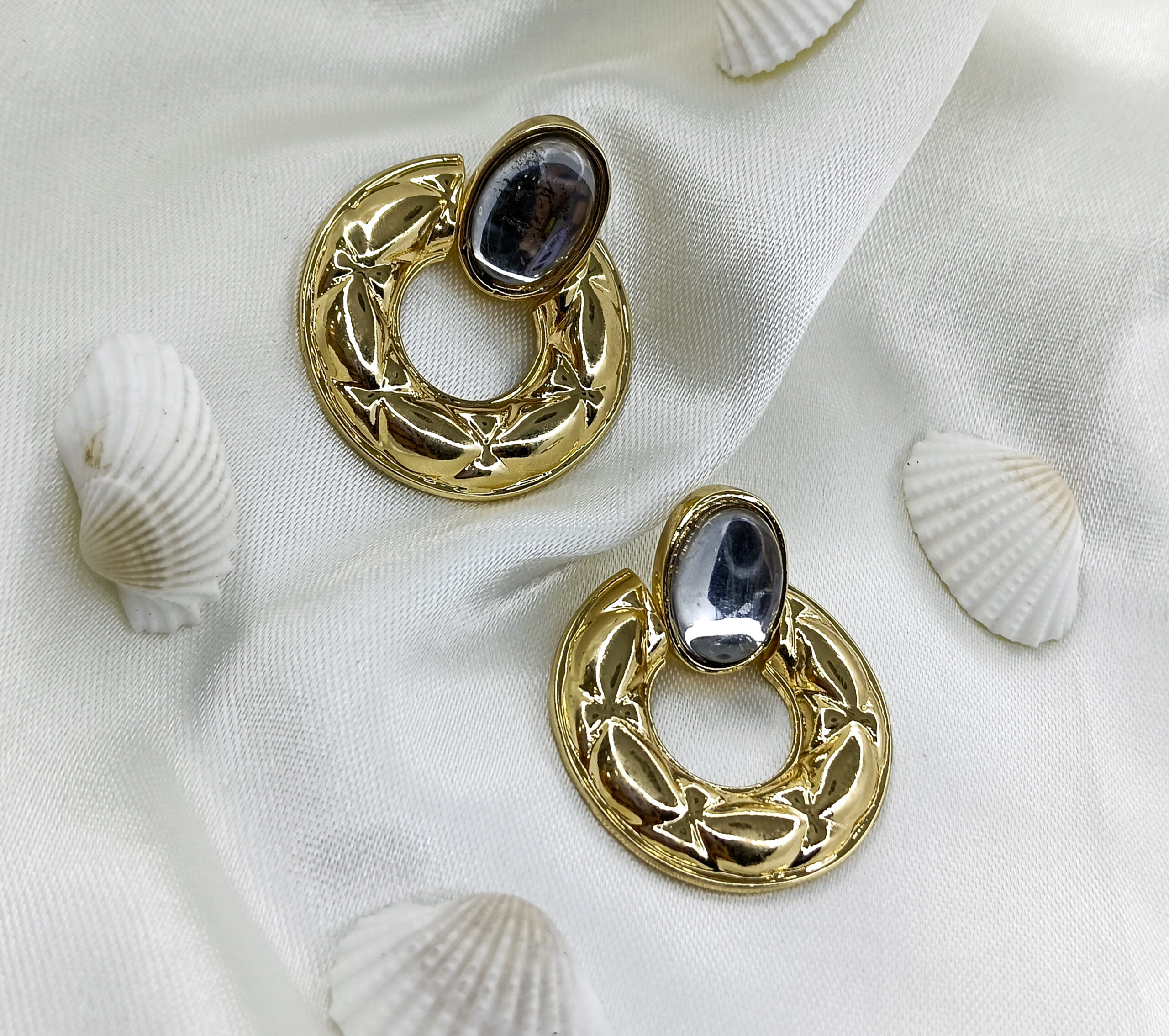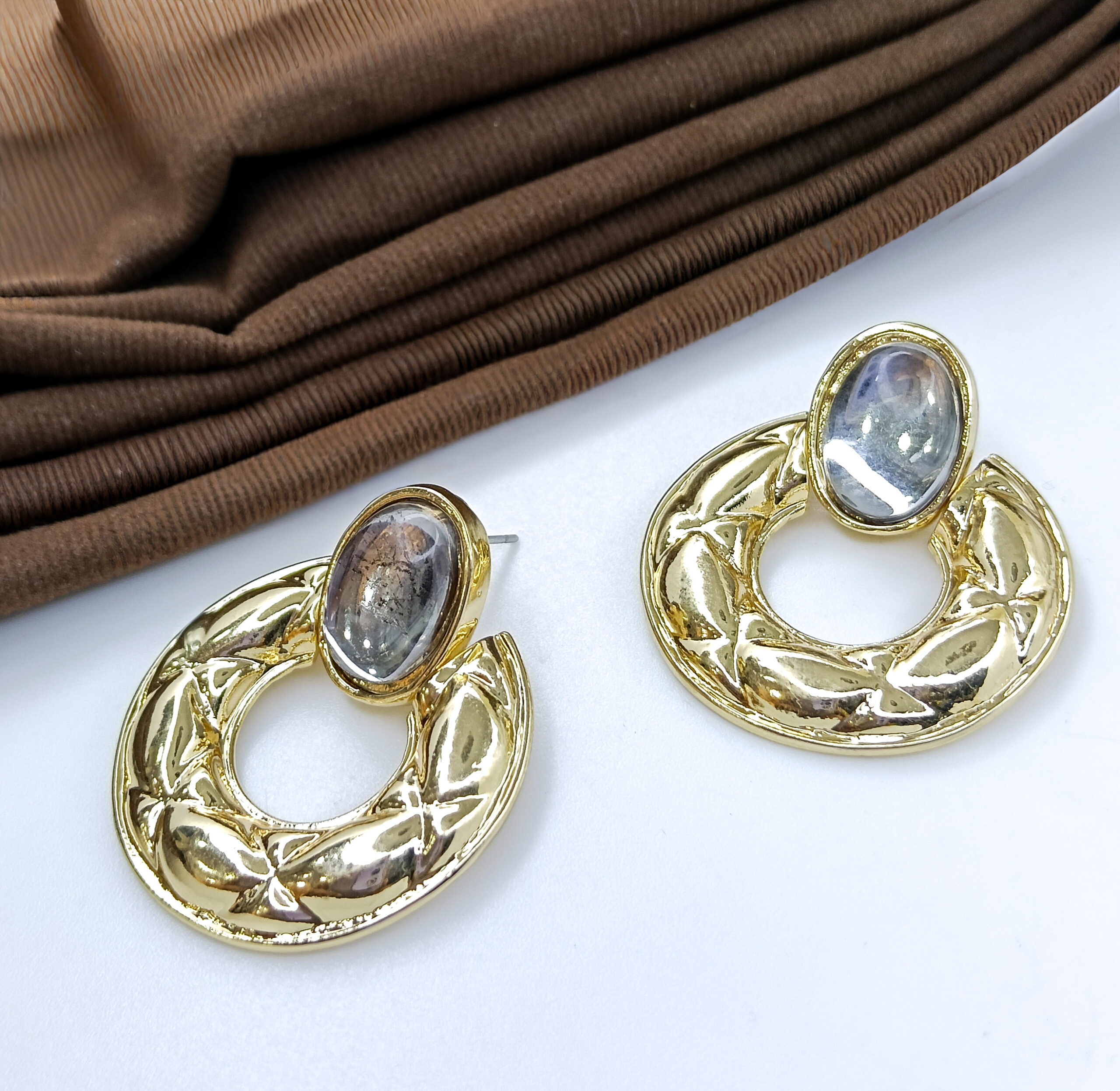These statement earrings feature a bold, textured gold-tone hoop paired with a smoky gray oval stud at the top. The intricate detailing on the hoops adds depth and interest, while the neutral hues ensure easy pairing with a range of outfits. Their unique combination of classic gold and modern smoky accents makes them a standout accessory for both formal and casual looks.