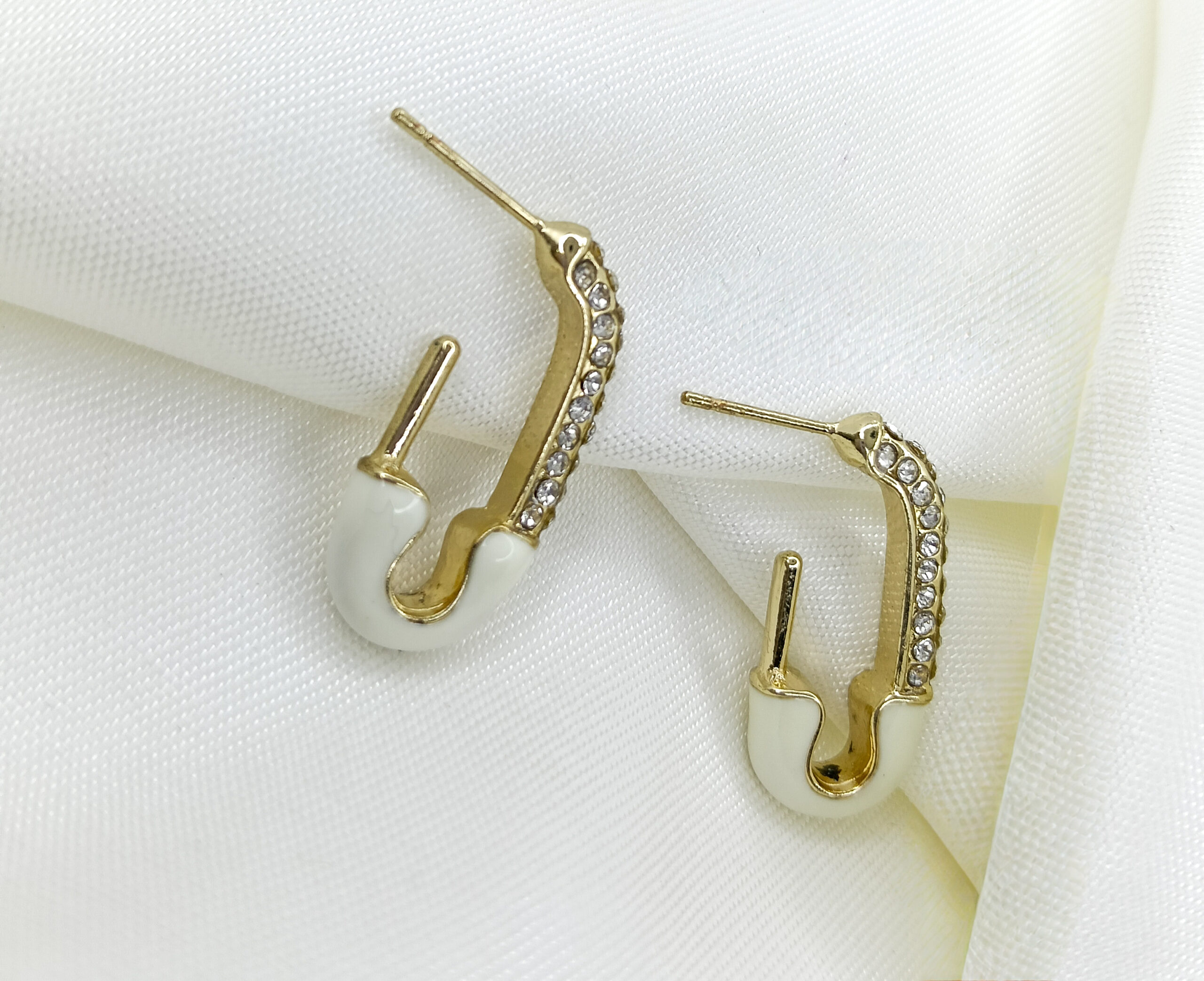 These fashionable earrings feature a playful safety pin-inspired shape in shiny gold tone with sparkling crystal embellishments and sleek white enamel accents. The unique design adds a modern twist to casual outfits, making them perfect for stylish everyday wear or fun gatherings. Lightweight and easy to wear, these earrings bring a touch of contemporary flair to any look.