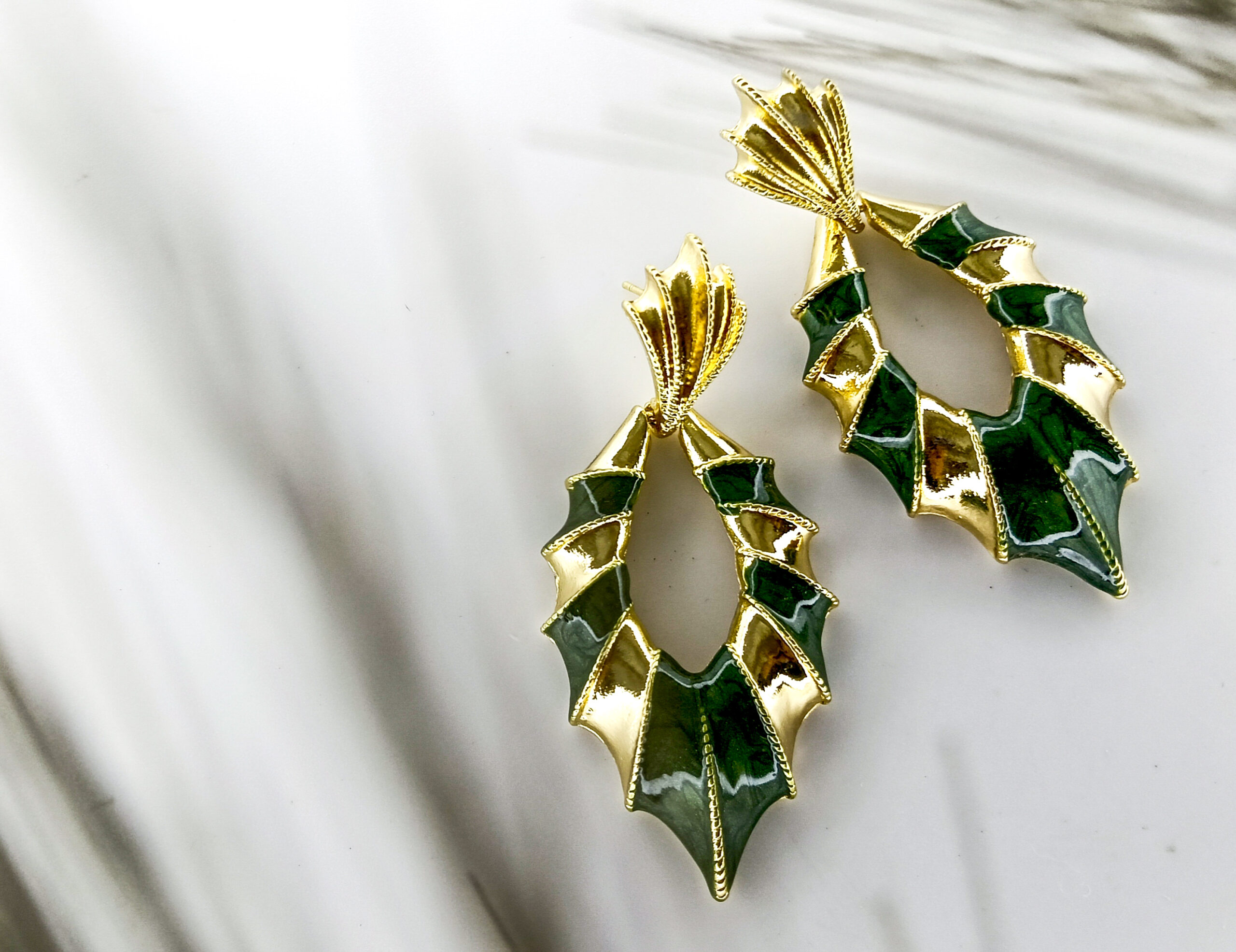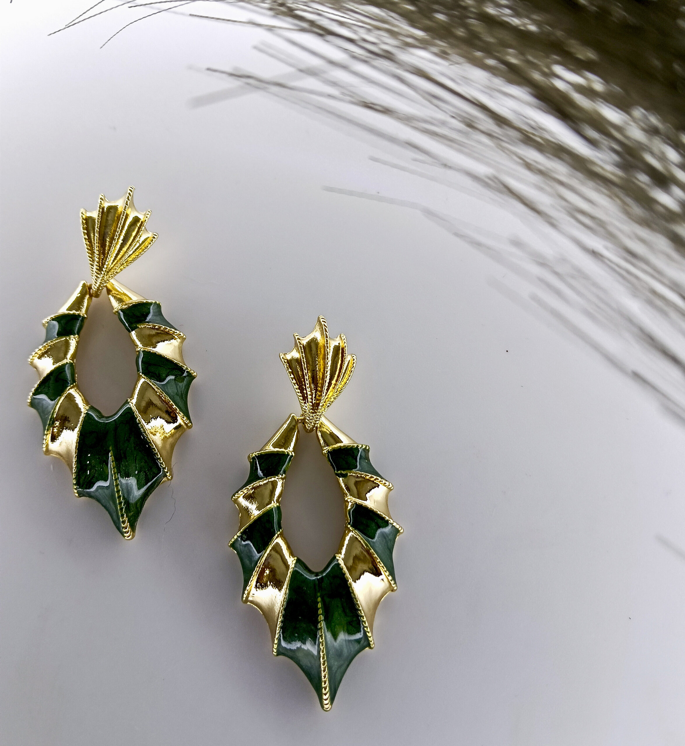 These standout drop earrings are inspired by lush tropical foliage, featuring a bold combination of deep green and shining gold segments. The leaf-like design is enhanced by detailed texturing and a flared top, creating a statement piece that captures the essence of exotic style. Perfect for adding a vibrant touch to summer outfits or for making an impression at festive events.