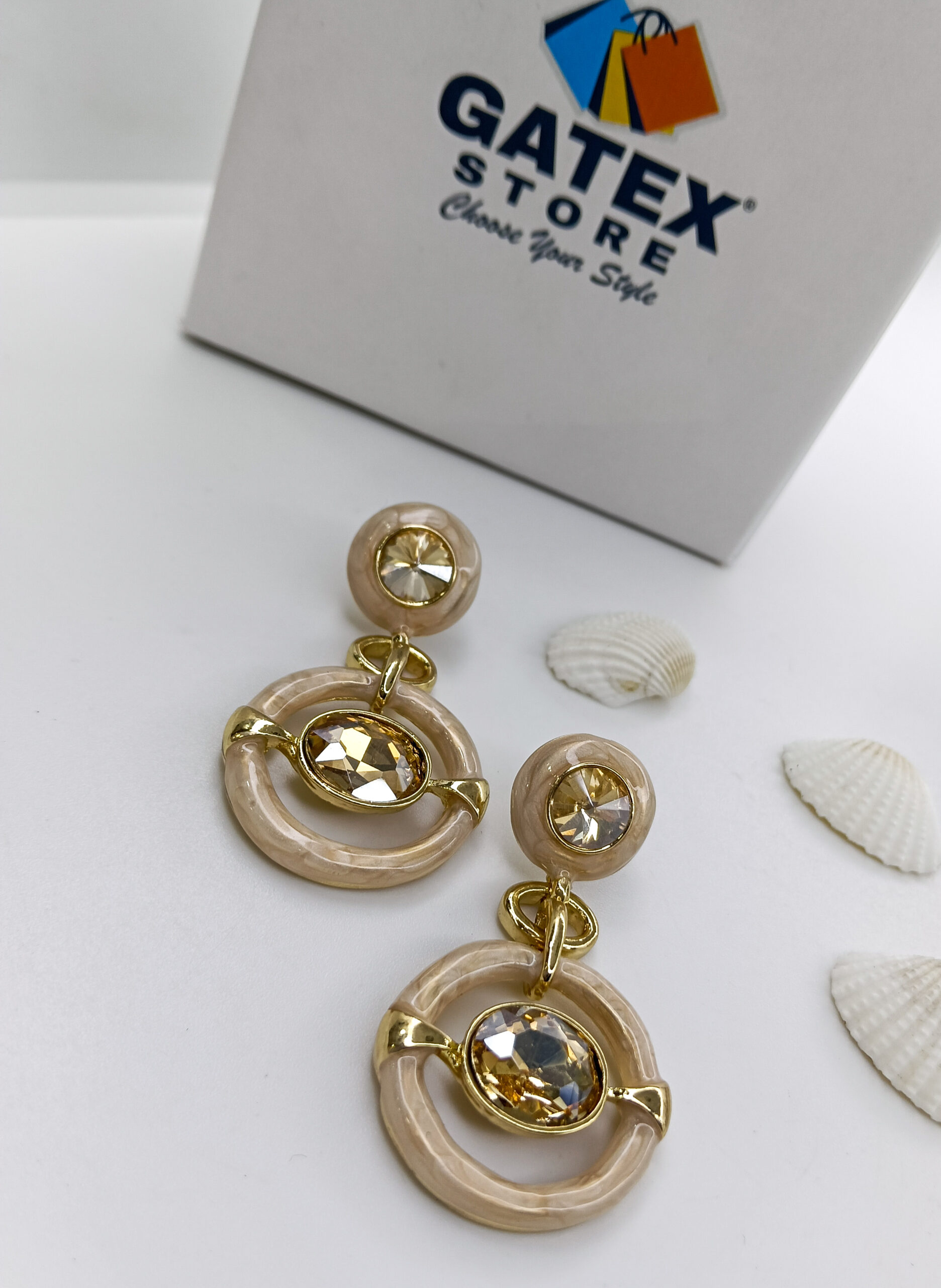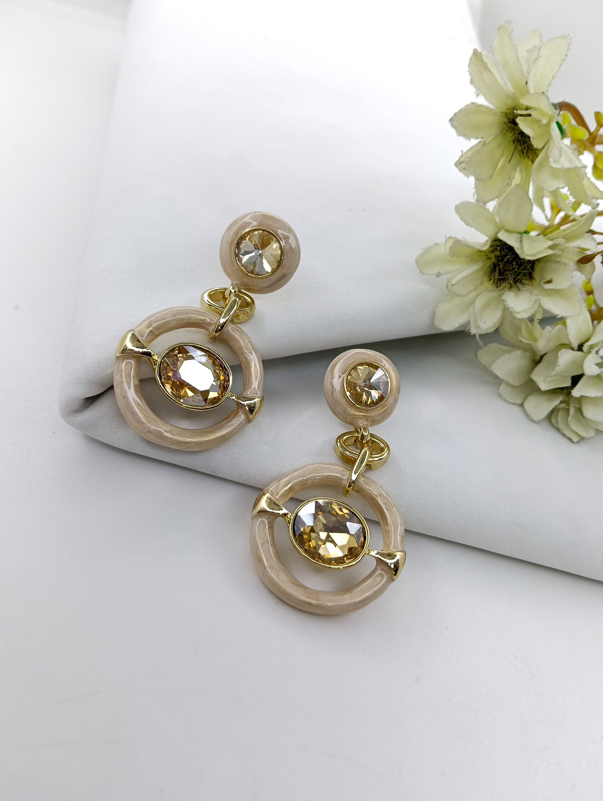 These stylish drop earrings combine a soft beige circular design and shimmering golden accents for a vintage-inspired look. Each earring features a round top stud embellished with a faceted gem, leading to a double circle drop with a central oval gemstone. The classic shape and warm tones make them perfect for both elegant events and chic day-to-day accessorizing.